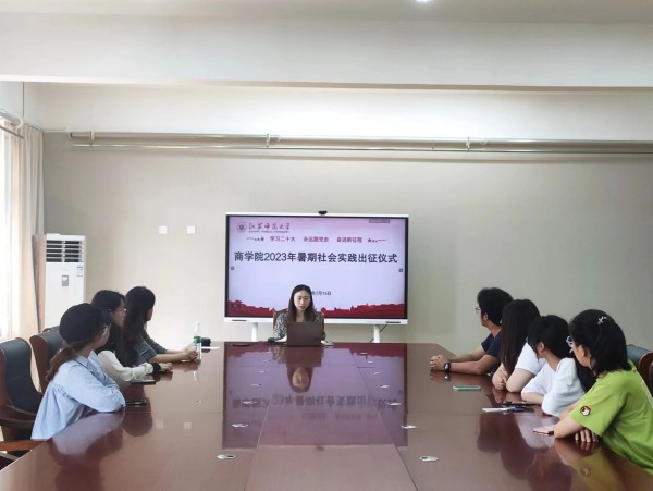 为深入学习宣传贯彻习近平新时代中国特色社会主义思想,践行习近平总书记大学生社会实践观,引导和帮助商院学子上好与现实相结合的“大思政课”,在社会课堂中受教育、长才干、作贡献,在观察实践中坚定信念听党话、跟党走,以青春力量奋进“两个先行”,学院于7月15日举行了2023年商学院暑期社会实践动员会,本次会议为线上与线下相结合的方式开展,商学院党委副书记吴夏蓉、院团委书记鲍春晓、省级“垃圾分类”专项先进个人梁嘉乐、7支社会实践团队成员和个人实践代表参加会议。