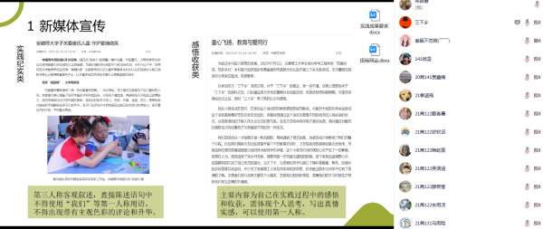 最后,梁嘉乐从“三下乡”方向与流程、活动实施方案撰写、实践成果展示和宣传报道等三个方面分享了自己在参加社会实践活动的感受和心得。她重点强调了宣传报道照片的真实性、动态性和故事性,让照片“会说话”才是一篇好的通讯稿。