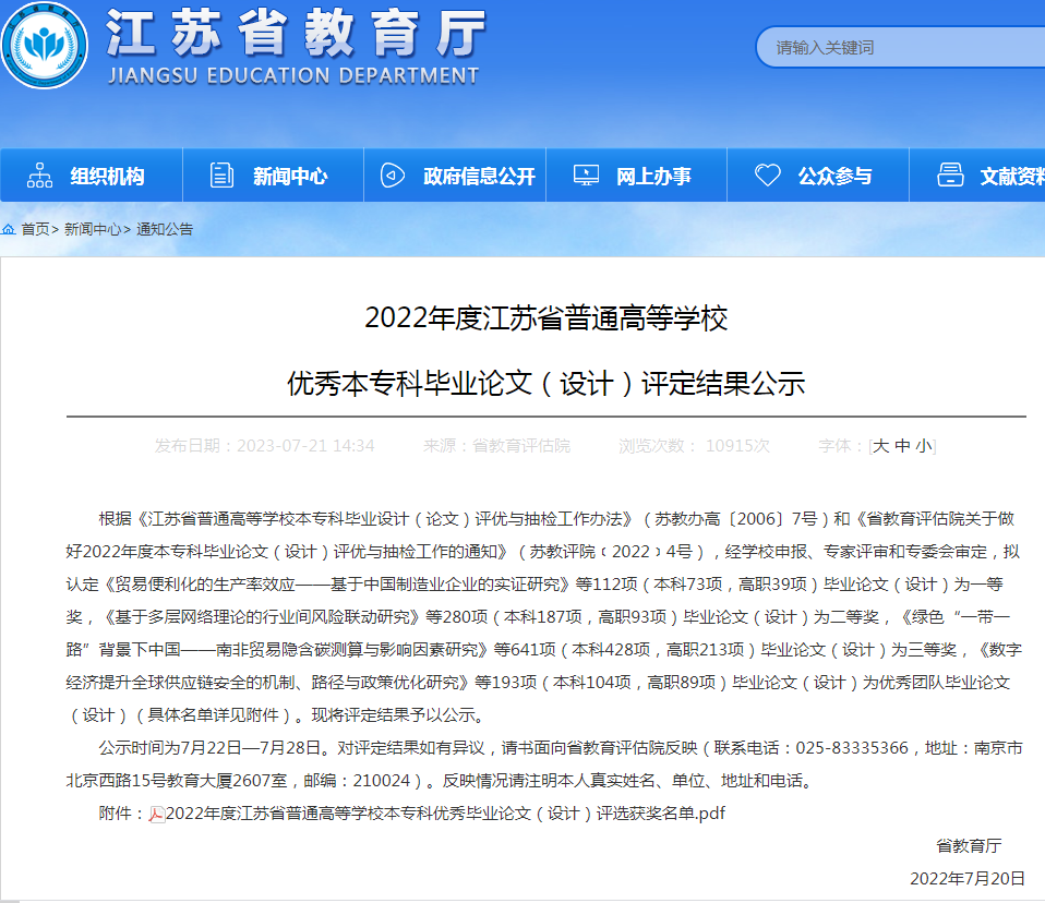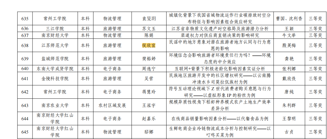 根据江苏省教育厅发布的最新消息,我院2022届毕业生侯欣宜同学的本科毕业论文《民谣中的地方意象对潜在旅游者地方认同与行为意愿的影响》获2022年度江苏省普通高等学校优秀本专科毕业论文(设计)本科组三等奖,这是我院旅游管理专业连续第三年获得省级优秀毕业论文。