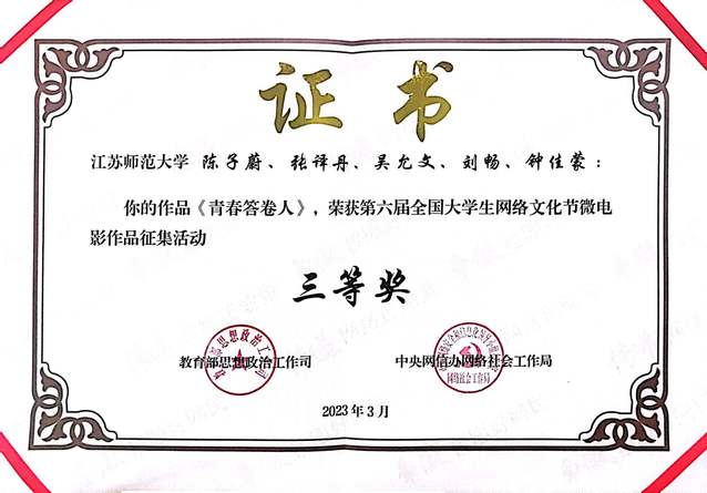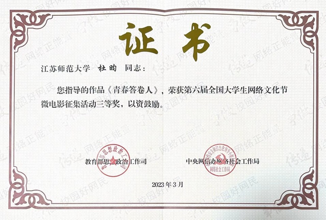 近日,由教育部思想政治工作司、中央网信办网络社会工作局联合主办的第六届“全国大学生网络文化节”遴选结果公布,书院师生作品《青春答卷人》荣获微电影类作品三等奖,在来自清华大学、北京大学等高校报送的30000余件作品中脱颖而出。