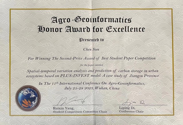 农业地理信息科学与工程国际会议旨在促进国内外农业遥感和地理信息技术领域最新成果的交流,加强前沿学科间的交叉融合。孙晨等同学积极参与该会并获奖,是我院学生在国际学术舞台上展示学院研究成果的成功尝试。