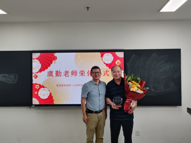 会议第三阶段,学院为退休的虞勤老师举办荣休仪式,为虞老师颁发退休纪念品、送上鲜花并合影留念,虞老师以自己39年的工作经历和感受与到会教师分享经验和心得,希望全体教职工学习虞勤老师兢兢业业的工作作风,勤勤恳恳做事,踏踏实实做人,永葆教师的初心和使命。