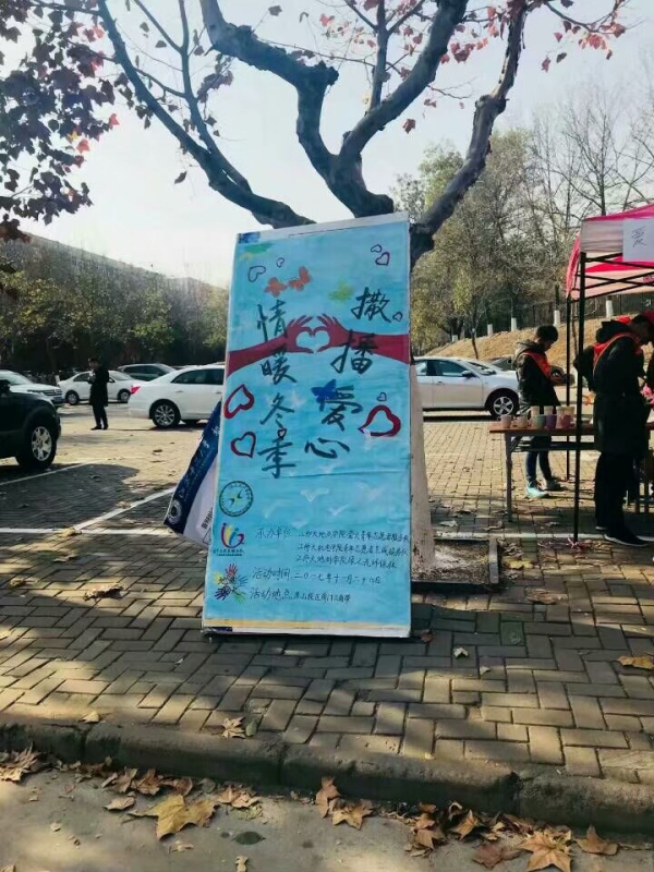 11月26日,我院至诚志愿者服务队携手地测萤火青年志愿者服务队和绿之光环保社在南门三角地带举行了“撒播爱心,情暖冬季”的爱心义卖活动。