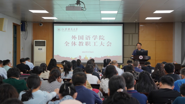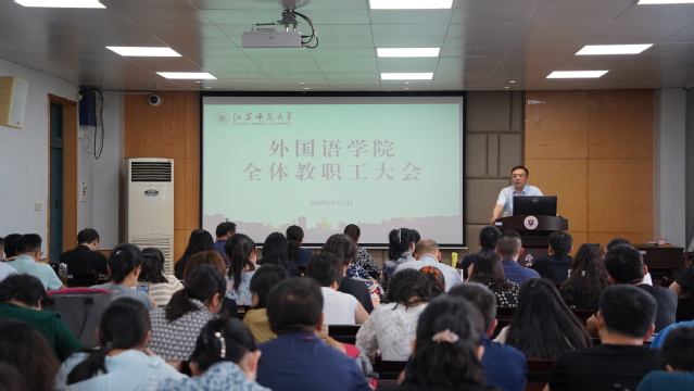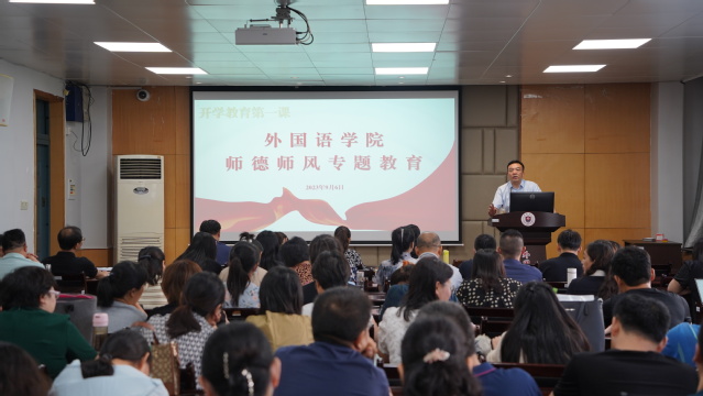 9月6日下午,外国语学院召开新学期全体教职工大会,专题开展开学教育第一课暨师德师风专题教育活动。