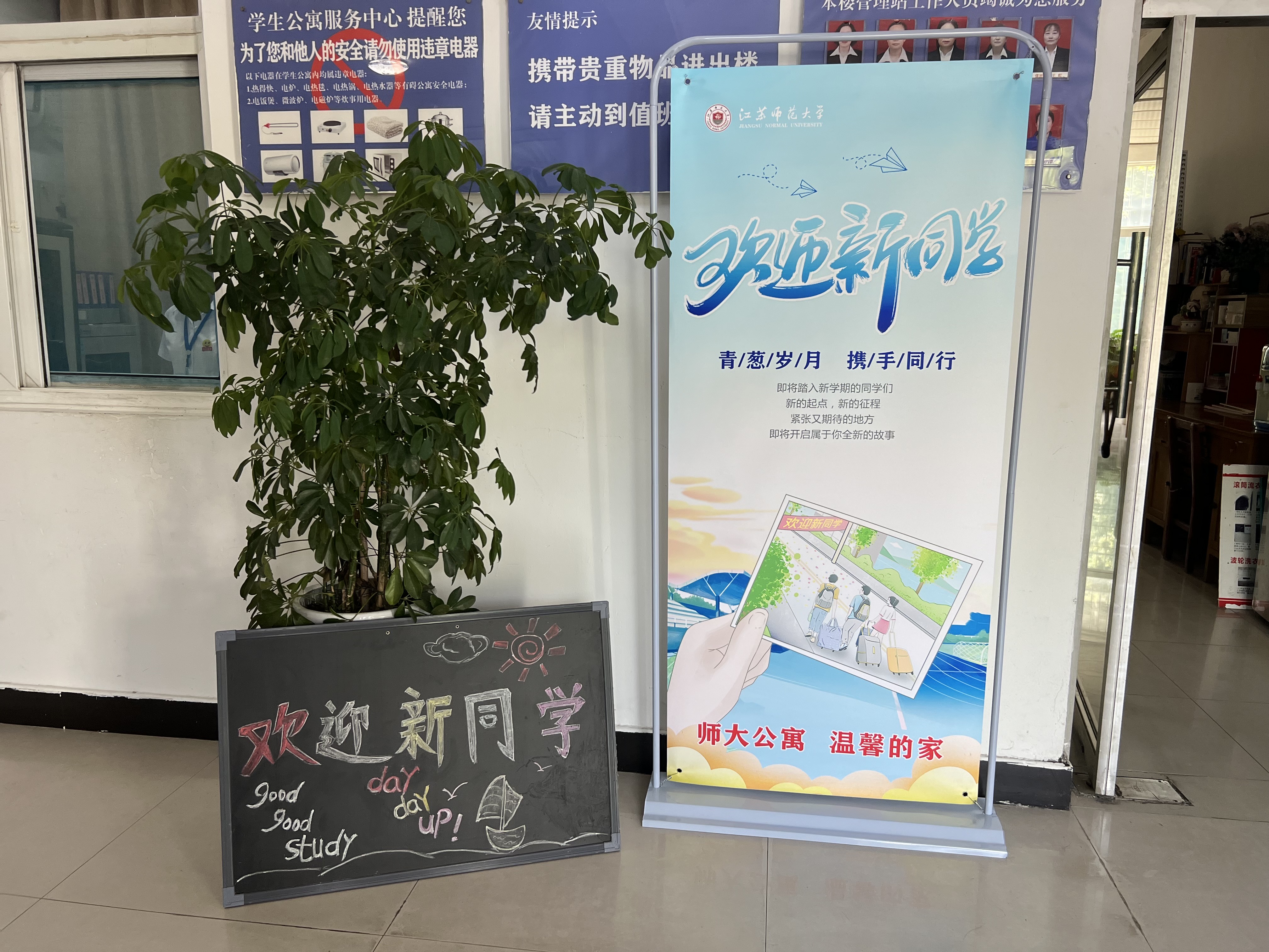 公寓服务中心无论是在新生报到注册、宿舍入住,还是在生活用品领取等环节,工作人员都仔细讲解,耐心解答。为到来的新生和家长们提供了免费的饮用水和绿豆汤,一解炎热带来的烦躁心情。此外,一条条充满爱意的条幅、诙谐的板书、多样的照片框、微笑的服务通过不同方式营造温馨的迎新氛围,让新生们在陌生的环境中感受到了家的温暖。