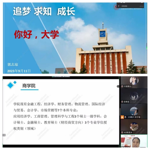 为进一步加强对新生思想引领,培养新生爱校荣校意识,增强对学校的荣誉感、认同感和归属感,教育引导新生尽快适应校园新环境,明确大学学习目标,做好大学规划,商学院于9月11日上午开展了“追梦·求知·成长——你好,我的大学”主题讲座,由辅导员郭志琼主讲。