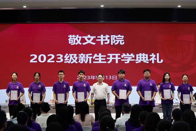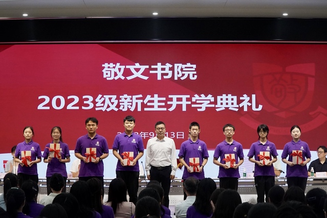 典礼上,周汝光校长为新生代表颁发敬文书院录取荣誉证书,赵鹏副校长赠予新生代表《知行敬文》一书,书院党委书记朱景坤向新生代表授予院徽。全体新生手抚院徽、面对院旗进行入院宣誓,坚定而洪亮地表达了“志在许国,吾为栋梁”的豪情壮志。开学典礼在激昂的《奔跑吧,敬文的少年》歌声中落下帷幕。
