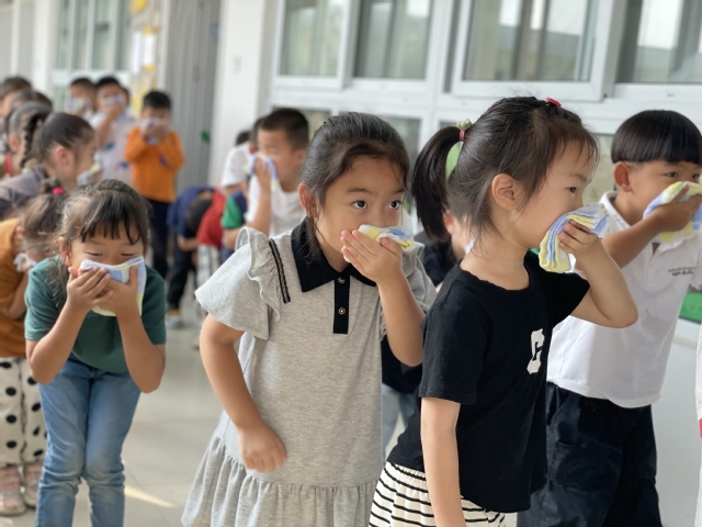 演练开始,幼儿园通过广播下达警报,班级教师组织幼儿有秩序地迅速撤离。到达指定位置后,各班老师马上清点人数,向现场指挥汇报。