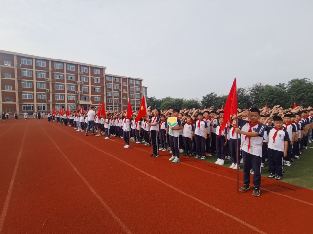 伴随着雄壮的《义勇军进行曲》奏响,五星红旗冉冉升起,一声敬礼,全体少先队员行队礼,在庄严肃穆的气氛中共同回忆历史,缅怀先烈。