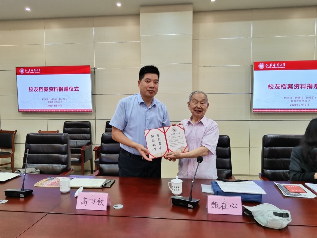 捐赠仪式上,董佳佳副馆长向大家介绍了甄在心书记和本次捐赠基本情况。甄书记退休后一直关心关注学校各项事业,曾多次向学校捐赠个人珍藏档案资料。此次,甄书记捐赠了1960级数学系本科生的原始资料,并向教育发展基金会(校友联谊会)捐赠了包含早年珍贵照片的纪念册,这些都是我校自1952年建校以后较为早期的原始资料证明,对于校史的鉴定和佐证,具有非常重要的作用。活动中,高田钦主任为甄书记颁发了捐赠证书。随后,甄书记详细介绍了所捐赠档案物品的内容、来源背景等情况,在场全体人员深深地被甄书记对母校的深情关怀所感动,甄书记带来的不仅仅是这些珍贵的资料,更是对学校深厚的情谊,对学校发展的期望和对大家工作的嘱托。周晓云副馆长代表档案馆(校史馆)向甄书记表示感谢,感谢他对学校档案事业的关心和支持,并表示档案馆一定认真做好捐赠物品的整理、保管和展陈,使珍贵的档案资料成为传承学校精神的重要载体,充分发挥档案的育人功能。