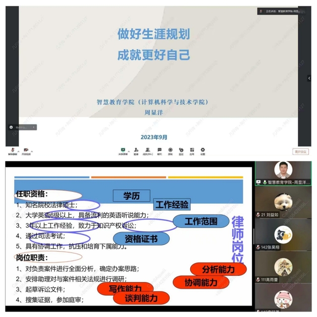 周显洋首先强调了生涯规划的重要性,指出明确的职业目标可以帮助同学们更好地实现个人的职业发展和人生理想,并结合往届毕业生的案例,强调要养成良好的习惯、重视专业学习以及把握机遇。接着他分享了辅导员工作案例和公务员工作案例,提醒同学们要清晰地了解自己的需求和目标,并努力克服困难,追求个人事业的成功。通过实际经验告诉同学们成功的职业规划需要综合考虑个人兴趣、能力和市场需求等因素,并随时调整策略以适应变化的环境。最后,周显洋为大家提供了实用的方法和工具来帮助大家合理安排职业生涯规划,鼓励学生们在大学期间充分抓住机遇,不断提升自己,为未来做好准备。