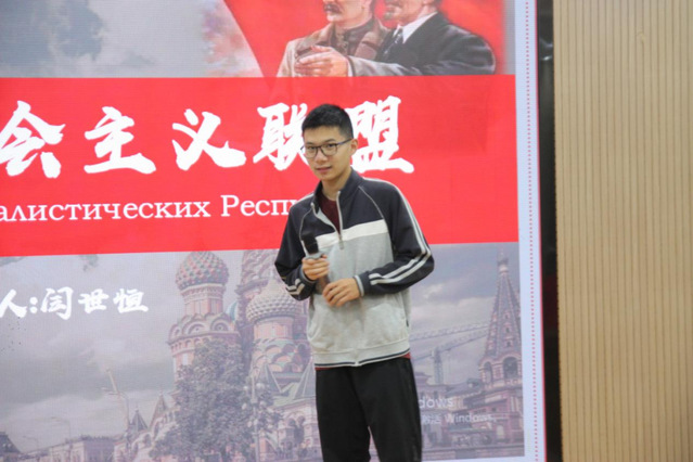 活动开始,闫世恒同学以苏联的国旗,国名全称,军事力量等方向展开了演讲。苏联全称是苏维埃社会主义共和国联盟,从格式上来说,这是一个相当特别的国名。而苏联在其存在期间,军事实力之强大,是二战之后世界上唯一能和美国一争高下的国家。
