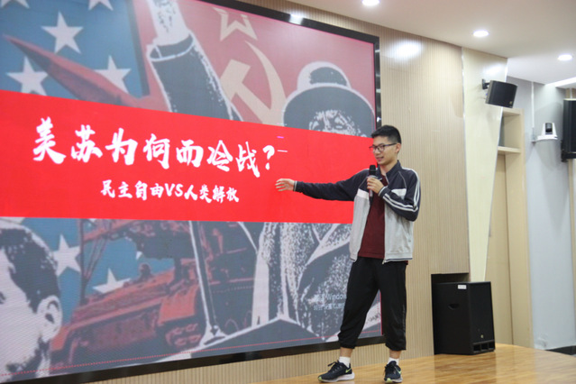活动过程中,闫世恒同学以“美苏为何会冷战”“冷战带来的社会科技进步”为题,引发所有同学的思考,同学们争相竞答,会场传来阵阵笑声。通过此次活动,让同学们对苏联有了一个更加深入的了解,激发了同学们对历史的兴趣,同时也提高了同学们对于苏联文化以及苏维埃政权的知识储备,用历史事实告诉同学们“劳动人们从不低贱”。