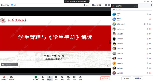 刘萌首先给同学们解释了“崇德厚学,励志敏行”的校训以及“守正出新,坚志勇为”的校园精神。接着她从政策法规、学籍与学位管理、行为规范与日常管理、奖惩管理、资助管理、图书借阅六个方面对《学生手册》进行了详细全面的介绍,并对各类奖学金的评定、十佳班级及先进班级的评选方法、违纪处理规定等内容进行了重点解读。最后,刘萌用“打牢基础、拓展能力、磨练意志、锤炼品格”四个关键词勉励新生,提醒同学们大学生活更需要学生的自我管理、自我监督,强化自身规则意识,希望新生同学能牢记《学生手册》中的规章制度,厚植家国情怀和社会责任感,去追求一个充实而有价值大学生活。