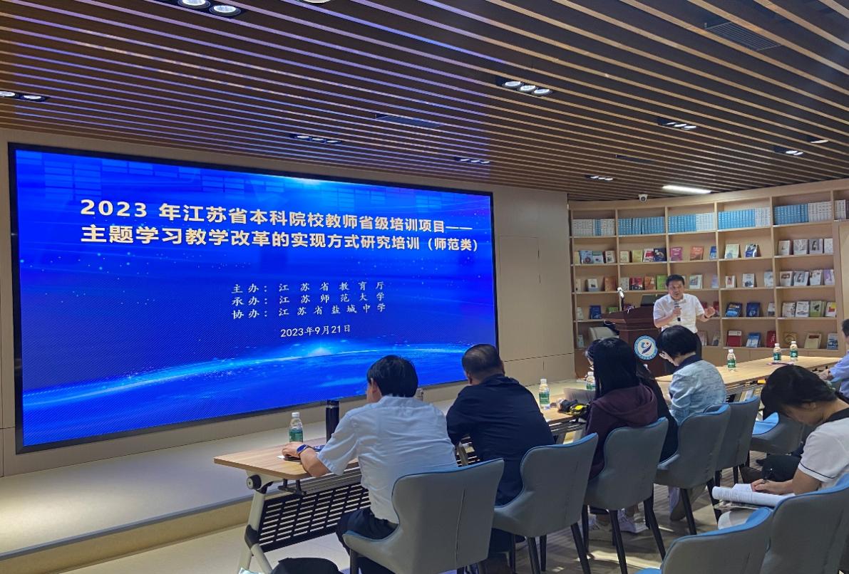 2023年9月21日至23日,2023年度江苏省师范院校文科学科课程与教学论专业教师高级研修班在盐城举办。本次研修活动的主题是:“主题学习教学改革的实现方式研究”。活动由江苏省教育厅主办,江苏师范大学承办、江苏省盐城中学协办。江苏省教师教育专业指导委员会文科分会主任委员、江苏师范大学魏本亚教授全程参与活动。来自江苏各高校的文科学科课程与教学论专业教师代表参与此次活动。