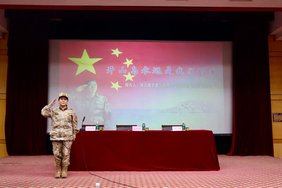 全场师生共同观看宣传片《守岛32年》,通过影像画面,了解王继才、王仕花夫妇“你为国家守岛,我为你守家”的感人故事。观影后,王仕花同志围绕“弘扬爱国精神,奉献新时代——开山岛永远是我们的家”这一主题,进一步讲述与丈夫王继才共同守卫开山岛的难忘岁月。她在分享中提到,在与丈夫王继才共同坚守开山岛的32年里,面对艰苦的环境和孤独的生活,“每日升起的国旗”成为他们从不退缩的底气。王继才同志因公殉职后,王仕花继续坚守在岛上,继续传承着夫妻二人的家国情怀和无私奉献精神,诠释了爱国信念的力量与深厚的报国热忱。