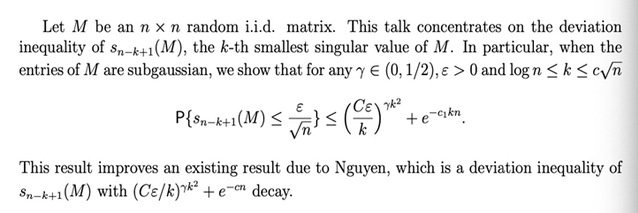 报告题目:Quantitative estimates of the singular values of random i.i.d. matrices