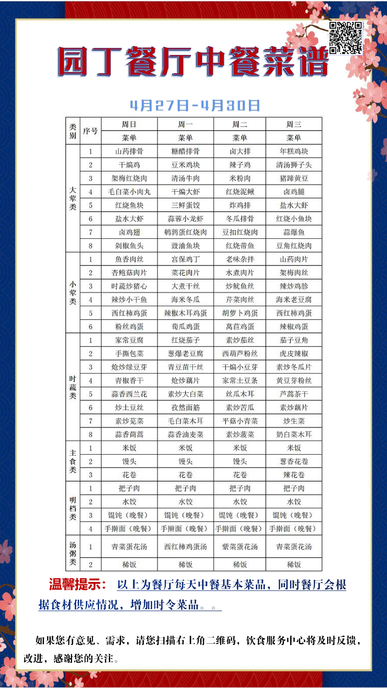 根据大数据分析,餐厅11:25-11:35、11:45-11:50、12:00-12:05三个时间段为就餐高峰期,为了减少排队等待时间,老师们可以选择错峰就餐。餐厅所有食材当天购买、当天使用,菜品新鲜,安全卫生。