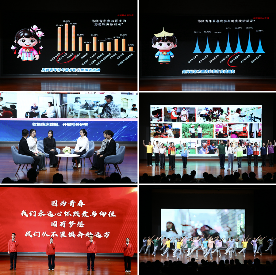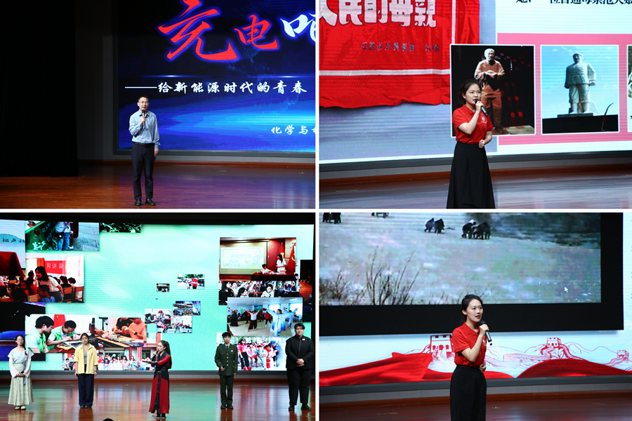 表彰大会上,我校青年师生通过宣讲、访谈、纪实短片、朗诵、风采展示等多种形式分享了他们朝气蓬勃、昂扬进取的青春风貌。大会发布了由我校青年学生结合人工智能技术设计的“青春苏师”青年卡通形象;“星汉”青年宣讲团成员带来的宣讲团进思政课“微展示”《读懂“坚持以人民为中心”背后的“为民密码”》,以青年视角解读党的创新理论,传递信仰之声;青年展示《青春闪光点:寻找闪闪发光的你》中,5位“追光青年”代表分享了各自独特的青春故事,展现了我校青年的多样风采;《挑战归来话成长》以“微访谈”的形式,邀请“挑战杯”竞赛参赛学生分享了他们在科创竞赛中淬炼成长的难忘经历,展现了青年攻坚克难的创新锐气;风采展示《青春走向田野》展现了我校众多团队和个人投身基层实践、甘于奉献的生动场景;第26届研究生支教团在支教地自行拍摄的纪实短片展现了志愿者扎实的教育教学工作,志愿者代表的朗诵《支教十年筑梦川陕:我们的青春在西部》回顾了我校志愿者十年来接续奔赴陕西、四川开展支教工作的奋斗历程;化学与材料科学学院院长赖超教授的宣讲《充电吧!——给新能源时代的青春“蓄个大的”》用三个关键词:“打破”“接纳”“超越”分享了自己的成长经历,鼓励青年学生既要经得起岁月的“循环充放”,又能在国家需要时毫无保留地释放青春能量;校、院学生会代表《像我们这样的朋友》展示了我校各级学生会组织扎根校园、服务青年的特色项目,大会在青年们自编自演的原创歌舞中圆满结束。