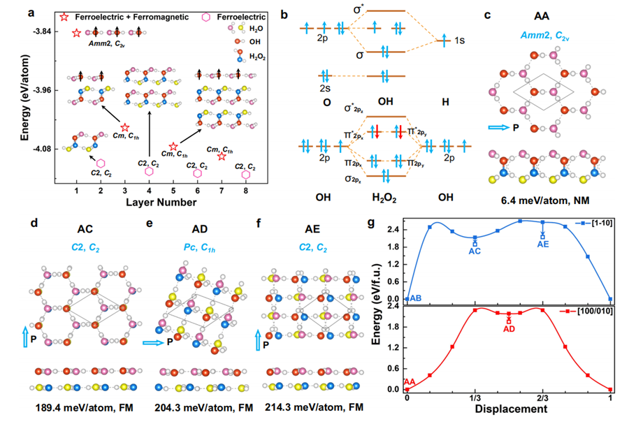 基于电子配对的基本原理,该团队提出了一种通过层间堆叠或滑移调控磁性相变新策略。采用吉林大学马琰铭院士团队自主研发的CALYPSO晶体结构预测技术并结合第一性原理计算方法,预言了一种新型二维分子铁电材料——水-羟基(H2O-OH)单层结构。在该单层结构中,铁磁性起源于OH基团2p成键轨道上的未配对电子。因此,通过调控层间结构,可实现磁性的可逆切换:一方面,层间堆叠促进H2O2分子形成,使未配对电子配对,从而诱导铁磁性向非磁性转变;另一方面,层间滑移抑制H2O2分子形成,恢复未配对电子,从而实现非磁性向铁磁性转变。此外,这一磁相变过程可被外加电场有效调控。重要的是,受该理论研究指导,中国科学院物理研究所冯宝杰教授等人采用低能电子辅助合成方法首次在Ag(111)表面合成了H2O–OH单层到多层结构。这项工作为二维铁电材料中磁性的有效调控提供了全新思路,拓展了多铁材料设计与应用的可能性。