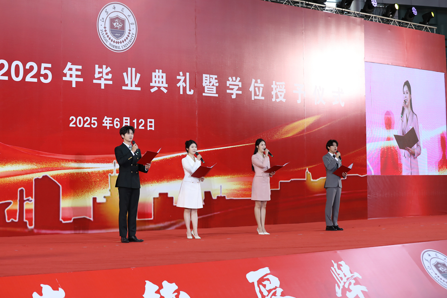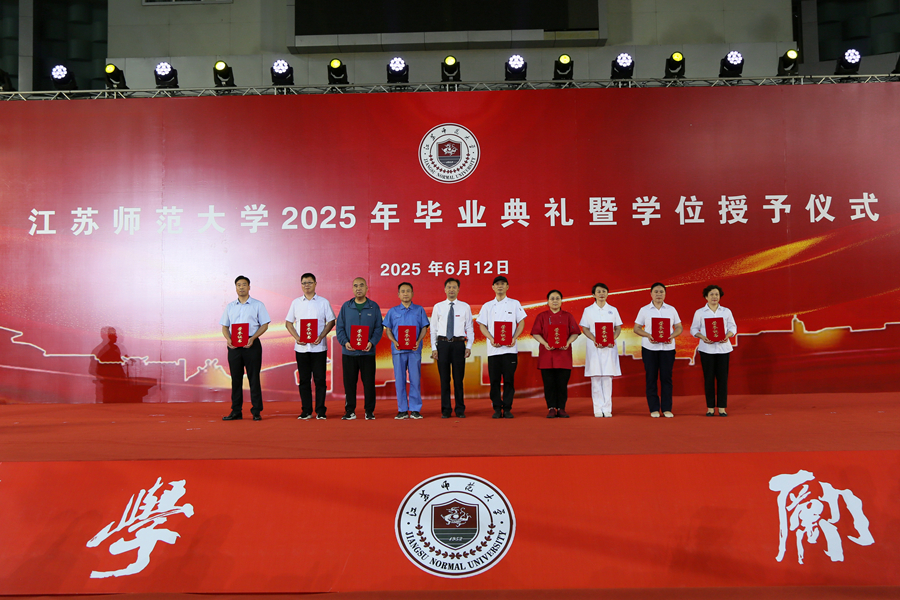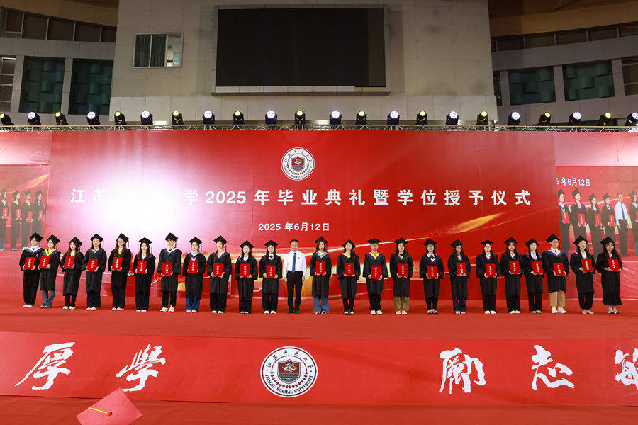 6月12日下午,江苏师范大学2025年本科生毕业典礼暨学位授予仪式在泉山校区体育馆隆重举行。全体校领导,校学位评定委员会全体委员,校学生工作委员会全体委员,各学院院长、党委副书记、专职辅导员、毕业班班主任,教师代表、校友代表、家长代表和2025年本科毕业生共同参加了典礼。典礼在暖场视频《江苏师范大学校歌》《时光筑梦:我们的苏师岁月》正式开始。典礼共分为《时光筑梦・青衿启航》《师恩如光・行舟引航》《山海奔赴・逐梦远航》三个篇章。