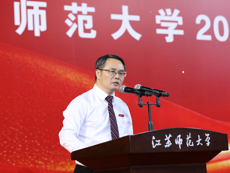 校学位评定委员会主席、校长杜增吉在典礼上致辞。杜增吉代表全校师生员工,向圆满完成学业的5706名毕业生同学表示热烈的祝贺,向各位家长和老师致以崇高的敬意和衷心的感谢。杜增吉指出,回首过去的四年,同学们秉承“崇德厚学,励志敏行”的校训,砥砺奋进,上下求索。恰逢江苏师大事业蓬勃发展的重要阶段,学校成功获批博士学位授予单位,实现办学层次的重大突破,这份荣耀离不开全校师生员工的拼搏奋斗,也是大家以青春活力共同谱写的辉煌篇章。杜增吉勉励全体毕业生:一是胸怀家国、勇担使命,做时代发展的奋进者;二是敢于探索、不断超越,做锐意创新的开拓者;三是知行合一、砥砺奋斗,做脚踏实地的实干家。最后,杜增吉祝愿2025年本科毕业生鹏程万里、一路繁花、前程似锦。