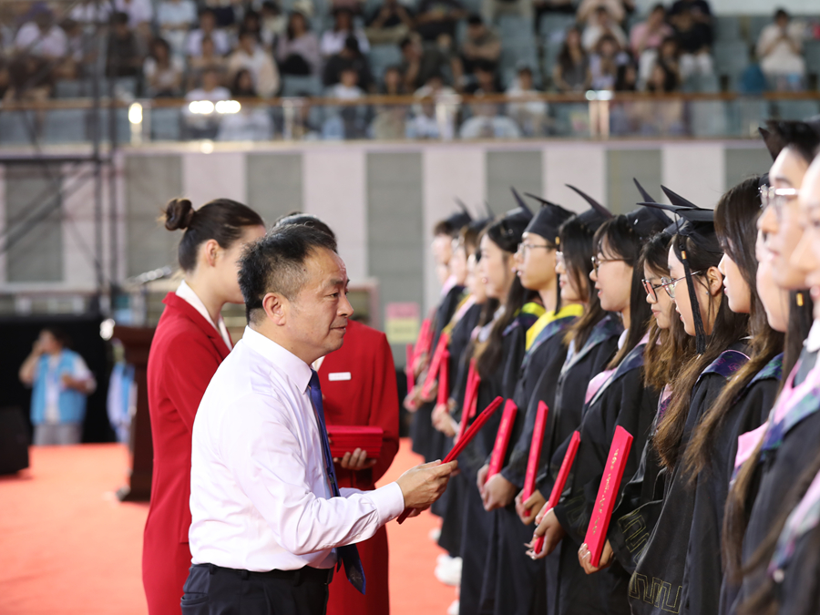 在这重要的四年大学时光中,同学们始终践行“崇德厚学,励志敏行”的校训,砥砺奋进、笃行不怠,书写了青春的奋进之笔。典礼上,副校长朱国军宣读了“2025届优秀本科毕业生”表彰决定,校党委书记芮国强为2025年优秀本科毕业生代表颁发荣誉证书并合影留念。