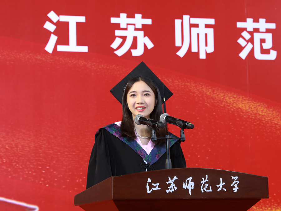 此时此刻,毕业生们也感触颇深,总有一些眷恋与不舍想在临别时分深情诉说。外国语学院夏唐文轩同学作为毕业生代表在典礼上发言,代表2025年全体本科毕业生向母校老师致以最深切的感谢。她与同学们一同回忆了在师大求学的宝贵时光,回忆江苏师大的点点滴滴,表达了对师长、对母校的留恋和不舍。