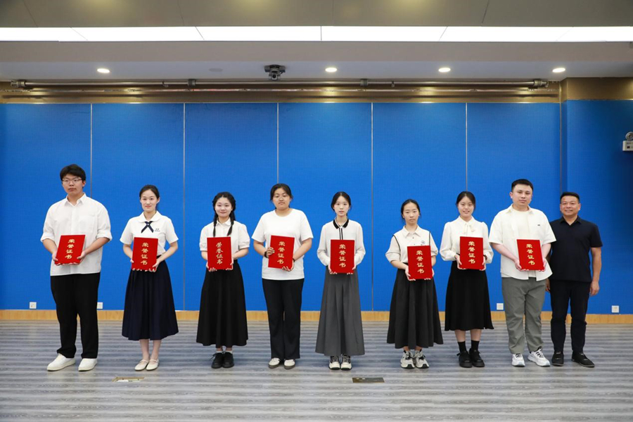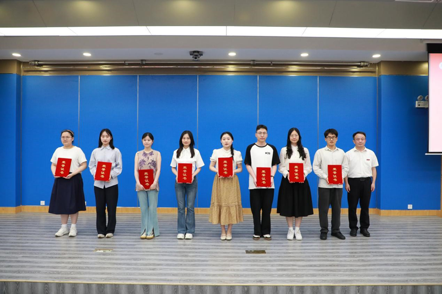 芮国强等与会领导为获奖学生颁奖。文学院21文16班叶琳代表获奖同学发言。