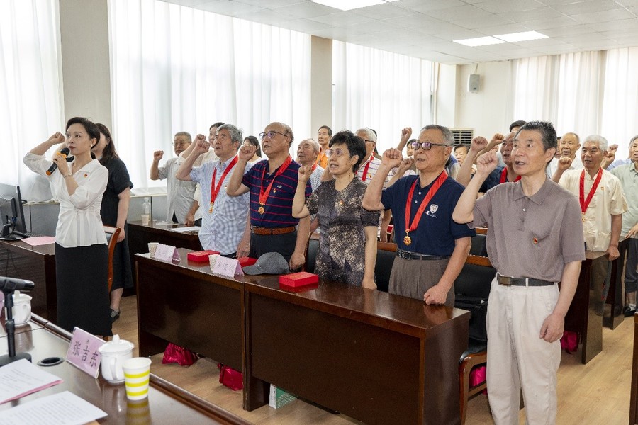 芮国强为10位党龄满50年的老党员一一颁发纪念章,代表学校党委对获得纪念章的老党员们表达了最崇高的敬意和祝贺。他指出,老党员们是学校发展的功臣与师生学习的楷模,他们用一生诠释了对党的忠诚与奉献。同时,芮国强也对全体党员提出四点期望:一是坚定理想信念,以老党员为榜样,用习近平新时代中国特色社会主义思想武装头脑,践行听党话、跟党走的追求;二是珍视党员身份,以老党员为灯塔,在各自岗位上发光发热,书写无悔青春;三是强化责任担当,聚焦学校“改革、拓展、转型、提档”中心任务,积极作为,推动学校高质量发展;四是传承优良作风,严守党的纪律,自觉抵制诱惑,共同营造风清气正的校园环境。他强调,全体党员要以此次活动为契机,传承红色基因,携手共创高水平师范大学的美好未来。