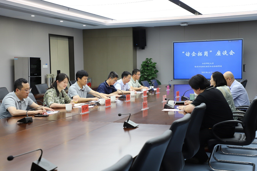 董晓臣一行首先来到南京江北新区管理委员会教育和社会保障局开展交流对接。座谈会上,董晓臣介绍了学校在学科建设、人才培养、科研研究及学生就业等方面的办学情况与特色优势。南京江北新区教育和社会保障局副局长朱珊珊介绍了江北新区的产业布局、人才需求及政策、企业见习实习资源及中学教师岗位需求等方面的情况。希望与我校在人才培养、企业实习、产学研合作等校地合作方面进一步深入拓展,实现校地共赢发展。