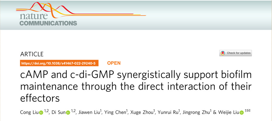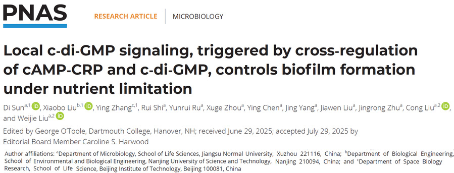 近日,我校生命科学学院刘伟杰/刘聪团队以我校为第一完成单位在自然指数期刊PNAS上发表题为“Local c-di-GMP signaling, triggered by cross-regulation of cAMP-CRP and c-di-GMP, controls biofilm formation under nutrient limitation”的长篇研究论文,揭示了细菌响应营养信号调控生物被膜的分子机制。我校生命科学学院孙地副教授、南京理工大学刘小波教授和北京理工大学张莹教授为共同第一作者,我校时蕊、汝昀睿、周徐鸽、陈颖、杨婧等5名研究生以及刘佳文、朱静榕老师参与本项研究,我校刘聪副教授与刘伟杰教授为通讯作者。