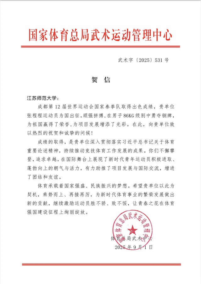 近日,备受瞩目的2025第12届世界运动会在成都圆满落幕。国家体育总局武术运动管理中心发来贺信,对我校体育学院学子张程程在成都第12届世界运动会男子 86KG 级别中勇夺铜牌表示祝贺,对我校输送优秀运动员表示感谢,并对学校在推动体育工作发展方面做出的贡献给予高度评价。