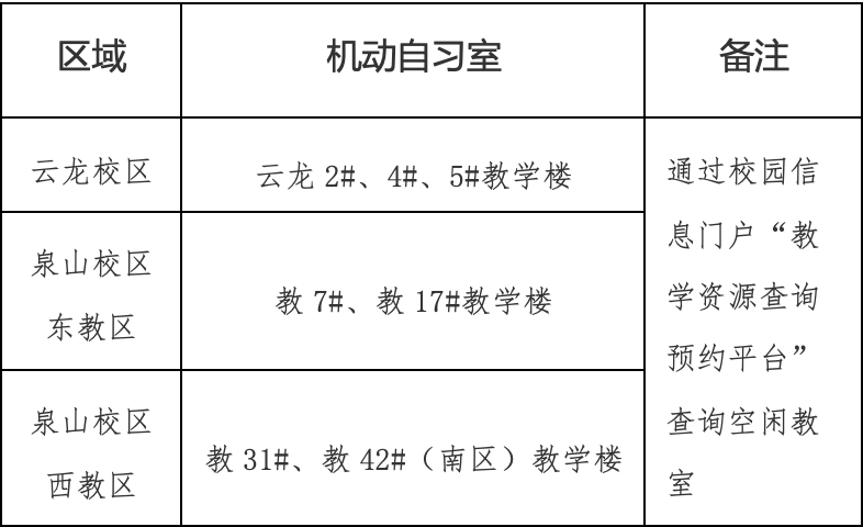 注:1).白天:通过“教学资源查询预约平台”或教室外课表查询对应楼宇空闲教室使用。
