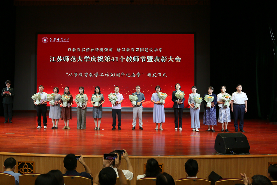 9月10日下午,江苏师范大学举办“以教育家精神铸魂强师,谱写教育强国建设华章”为主题的庆祝第41个教师节暨表彰大会。在校全体校领导、江苏省教育基金会副秘书长张虎成、各学院党政负责人、机关部门和直属单位主要负责人、教师代表、接受表彰的先进集体和个人代表、从事教育教学30周年教师代表、退休教师代表、新入职教师和学生代表参加表彰大会。