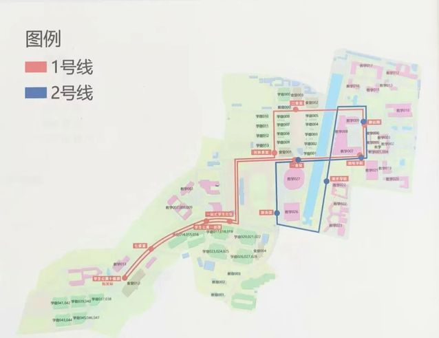 1号线:学生公寓十组团—七食堂—学生公寓一组团—一站式学生社区—一食堂—物电学院—静远楼—三食堂—民族餐厅—一站式学生社区—学生公寓一组团—七食堂—学生公寓十组团