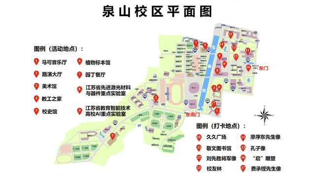 校友们可以到泉山校区久久广场、敬文图书馆、首任校长刘先胜将军像、校友林、廖序东先生像、孔子像、“启”雕塑、费承铿先生像;云龙校区师源楼、吴韵楼、汉风楼、“读书”雕塑、图书馆等地打卡拍照,和母校再次同框。