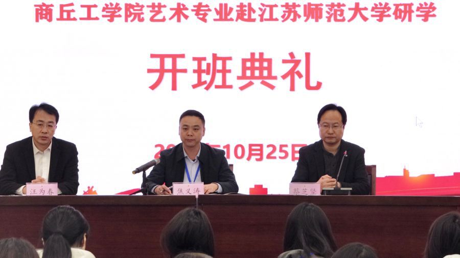 10月25日上午,开班仪式在江苏师范大学美术学院报告厅隆重举行。江苏师范大学美术学院院长蔡芝竖、继续教育学院副院长汪为春,商丘工学院教育与现代艺术学院党总支副书记焦义涛出席仪式,全体参训学员共同参加。开班仪式由江苏师范大学继续教育学院副院长汪为春主持。