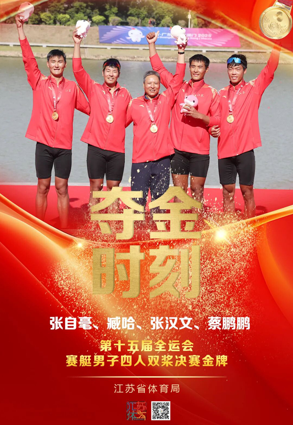 11月10日上午,中华人民共和国第十五届运动会赛艇项目决赛在广东国际划船中心举行,江苏运动员张自毫、臧哈、张汉文、蔡鹏鹏以4分12秒24的成绩夺得男子四人双桨金牌,这是本届全运会江苏水上项目的首枚金牌,也是本届全运会开幕式后的第一块金牌。