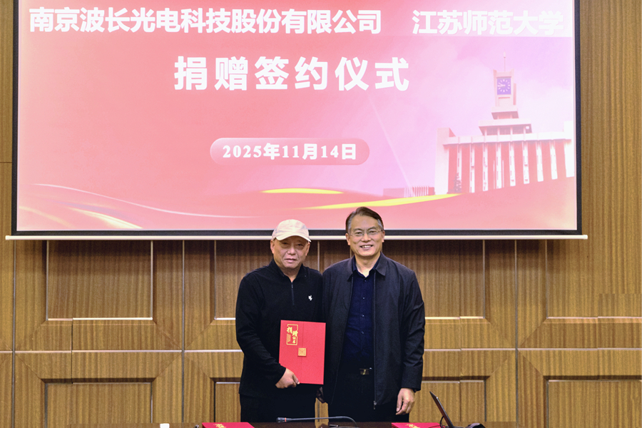 11月14日下午,南京波长光电科技股份有限公司捐赠签约仪式在泉山校区举行。南京波长光电科技股份有限公司总经理吴玉堂,校党委常委、副校长黄德志出席仪式,企业相关部门、校教育发展基金会、物理与电子工程学院负责人及师生代表共同参加活动。