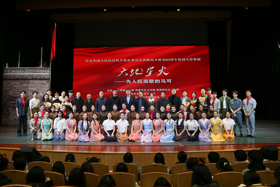 为纪念中国人民抗日战争暨世界反法西斯战争胜利80周年,弘扬爱国主义精神,引导青年学生坚定理想信念,11月18日晚,由党委宣传部、党委学生工作部、党委研究生工作部主办,音乐学院承办的大型原创舞剧《大地星火——为人民而歌的马可》在马可音乐厅成功演出。舞剧以徐州籍人民音乐家马可的光辉一生与不朽艺术为主线、以传承和弘扬“南泥湾精神”“延安精神”为内核、以讴歌教育家精神和育人实效为目的,为全校师生献上一场贯通历史与当下的精彩表演。校党委副书记蔡国春莅临演出现场,来自全校各学院400余名师生观看演出。