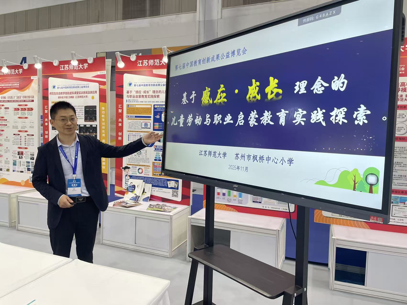 作为华东地区参展的核心成果之一,《基于“感应·成长”理念的儿童劳动与职业启蒙教育实践探索》由江苏师范大学教育科学学院和苏州市枫桥中心小学教育集团联合打造。2015年起,学院陈鹏教授领衔劳动与职业教育团队,基于大职教视野,直面当前中小学教育实践中存在的职业意识薄弱、职业价值偏颇、职普融通不强等问题,对职业启蒙教育的理论体系与实践模式进行系统探索。近年来在一线中小学逐渐试验推广。2021年起,学院团队与枫桥中心小学建立深度合作关系,进行了理论成果的校本转化,形成“基于‘感应·成长’理念的儿童劳动与职业启蒙教育”实践成果。