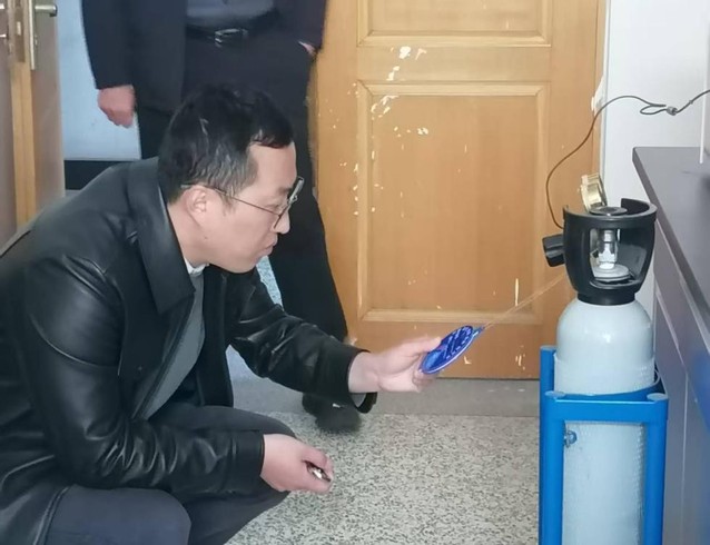 检查小组首先来到12号楼一楼C区环境与生态实验室。该实验室集中管理放射源、高压气瓶、氢氟酸等多类危险源,是学院重点安全监控区域。赵玉璋副书记仔细检查实验记录台账,核验气瓶固定装置与标识规范,并就大型仪器设备使用效率、危化品全流程管理等关键问题进行详细问询。实验室负责老师现场逐一解答,并演示相关安全管理措施。随后,在实验室检查过程中,同步开展实验教学和科研实验空间调研工作。朱长明副院长深入考察实验空间布局与设备资源利用现状,强调要充分利用有限空间资源,通过科学规划与优化布局,最大限度满足教学科研双重需求,为提升实验教学质量提供有力保障。最后,检查组实地走访了各研究生工作室,赵玉璋副书记面向在座研究生开展安全教育和提醒。他特别强调,秋冬季节是火灾高发期,全体研究生必须严格遵守学校安全管理规定,坚决杜绝违规使用大功率电器行为,确保用电安全常态化,及时清理室内杂物,保持消防通道时刻畅通。