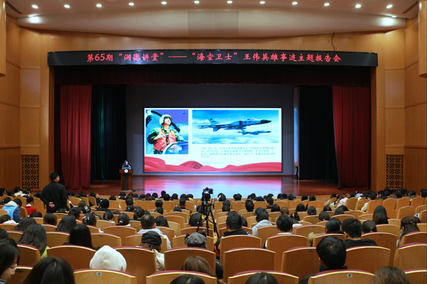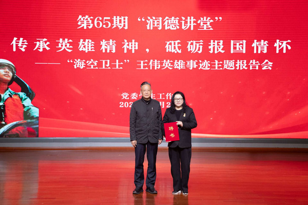 11月27日下午,第65期“润德讲堂”在马可音乐厅顺利举行。“海空卫士”王伟烈士的妻子、原海军上校阮国琴以“传承英雄精神,砥砺报国情怀”为核心,分享了王伟烈士的英雄事迹与精神传承,与师生共同缅怀先烈、汲取奋进力量。