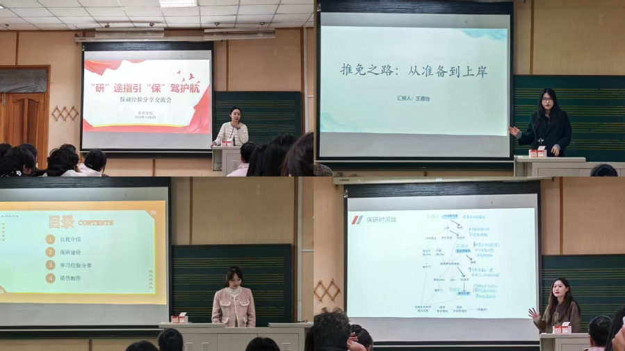 针对本科生升学需求,学院邀请三位成功保研的2022级学生开展“‘研’途指引‘保’驾护航”经验分享会。王嘉怡、蒋丹璐、田蕙荣三位同学分别从保研政策解读、院校选择策略、材料准备技巧及面试经验展开分享,现场互动环节,学生就专业排名、科研经历优化等问题与分享同学深入交流,解决了保研过程中的困惑,有效传递了宝贵经验与实用方法。