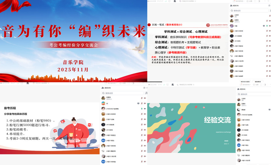 当前,公务员及教师编制考试的热度持续不减,学院开展音为有你 “编”织未来为主题的经验分享会,特邀已经成功入编的20级代靓、21级赵倩楠和黄峻豪等优秀毕业生从备考内容、岗位选择、面试技巧等方面入手,就北京、上海、徐州等热门地区的编制备考开展经验交流,为有意考公考编的同学提供了切实可行的方法指导。