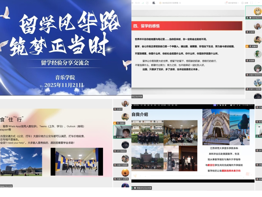 “留学风华路 筑梦正当时”线上留学经验交流分享会聚焦海外院校申请流程与跨文化适应,邀请我院20级舞蹈编导(师范)专业毕业生张端峰、19级音乐学(师范)专业毕业生张志恒和15级音乐学(师范)专业毕业生单航宇分享蒙古、韩国、英美及香港等热门留学目的地的准备经验,为在校生搭建了获取留学实用信息的平台,激励更多学生在更广阔的世界舞台上深耕专业、追逐梦想。