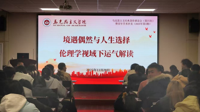 为进一步推动马克思主义学院的学术交流与思想对话,为师生搭建起沟通桥梁,营造良好的学术氛围。11月28日,马克思主义学院青年学术沙龙(2025年第3期)和马克思主义经典著作研读会在16#302报告厅举行,本次活动的主题为“境遇偶然与人生选择——伦理学视域下运气解读”,由马克思主义学院钟航博士主讲,陈晔博士主持。