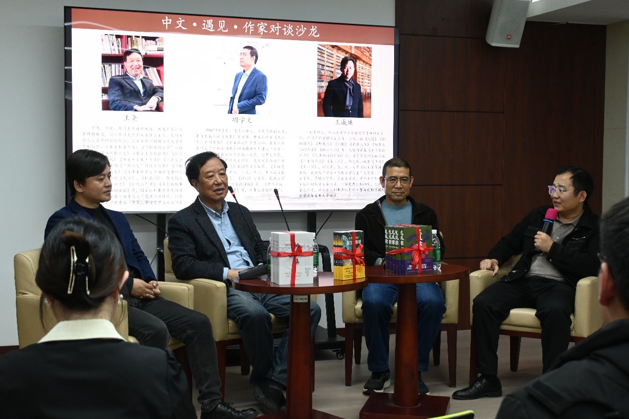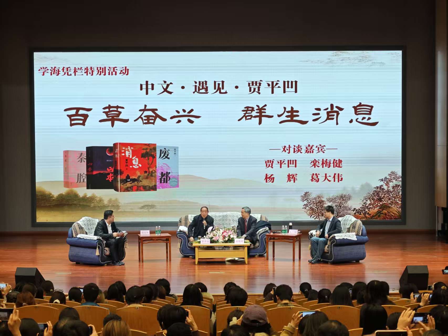 论坛开幕式上,举行了中国作协新时代文学研究中心(江苏师范大学基地)与安徽文艺出版社合作签约仪式。11月29日下午,贾平凹与栾梅健、杨辉两位学者在我校马可音乐厅开展“中文·遇见·贾平凹”学海凭栏活动,副校长娄峥嵘出席。活动现场互动精彩,气氛热烈,文学院桃蹊文学社、雷雨剧社等社团的学生和指导老师表演了《消息》《秦腔》等作品的配乐朗诵和秦腔唱段,娄峥嵘副校长为抽取的幸运观众颁赠了贾平凹老师亲笔签名的《消息》。11月29日下午,参会的三位作家王尧、胡学文和王威廉做客文学院,围绕“作家创作与新时代文学语境关系”展开作家沙龙活动,文学院100余位师生参加。活动期间,贾平凹等作家、学者还参观了位于文学院的中国作协新时代文学研究中心(江苏师范大学基地)展馆群,并为文学院题字留念。