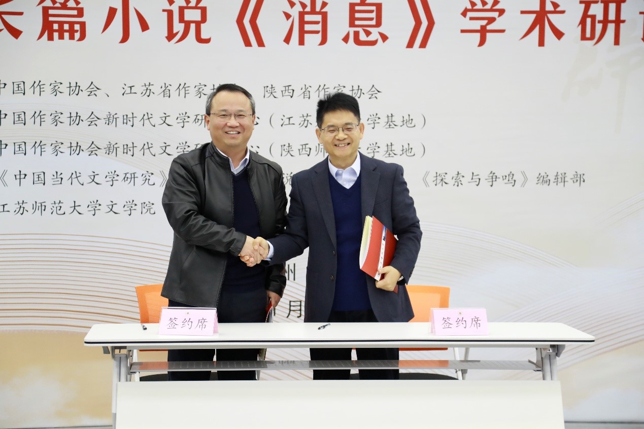 11月28-30日,由中国作家协会、江苏省作家协会、陕西省作家协会共同指导,中国作协新时代文学研究中心(江苏师范大学基地)、中国作协新时代文学研究中心(陕西师范大学基地)、《中国当代文学研究》杂志社、《小说评论》杂志社、《探索与争鸣》编辑部联合主办的新时代文学论坛(2025)暨贾平凹长篇小说《消息》学术研讨会在我校召开。中国作协党组成员、副主席、书记处书记吴义勤,中国作协原副主席、陕西省作协主席贾平凹,中国作协副主席、江苏省作协主席毕飞宇,徐州市委常委、宣传部部长刘伟,我校校长杜增吉、副校长黄德志等出席活动,来自复旦大学、南京大学、武汉大学、中南大学、上海大学、苏州大学等高校的专家学者和《文学评论》《当代作家评论》《扬子江文学评论》《文艺争鸣》《当代文坛》等重要期刊的编审、6家中国作协新时代文学研究中心负责同志参加会议。会议开幕式由副校长黄德志主持。